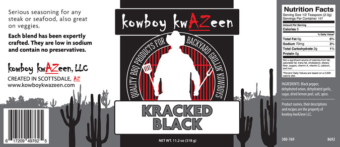 WOW!! This is your “go to” seasoning. Put this on everything you cook. A course ground black pepper rub and seasoning, highlighted with citrus and allspice. kowboy kwAZeen KRACKED BLACK rub and seasoning is fabulous on any steak. Great on lamb chops, awesome on shrimp, fish, or any seafood. Makes super easy roasted veggies, just toss with a bit of olive oil and roast. Try sprinkling kowboy kwAZeen KRACKED BLACK rub and seasoning on while sautéing any veggies. Makes a kickin’ vinaigrette. This rub and seasoning will make great home fries to complement your kowboy kwAZeen CHIPOTLE WRIB WRUB breakfast.
